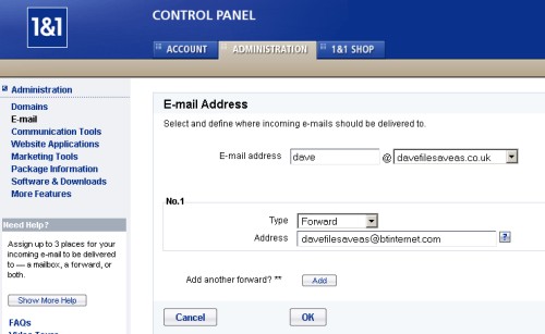 And that’s it. Should you wish, you can make changes to your email forwarding address, add other aliases (e.g. thewife@familyname.co.uk), or even direct your domain to a website – all by logging on to the 1 & 1 Control Panel.